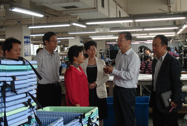 夏会长一行听取了海盟服装董事长黄培丰、总经理毛明辉关于公司发展历程、生产经营现况、未来发展规划等方面的情况介绍,并参观了公司生产流水线、CAD系统及成品展示厅。