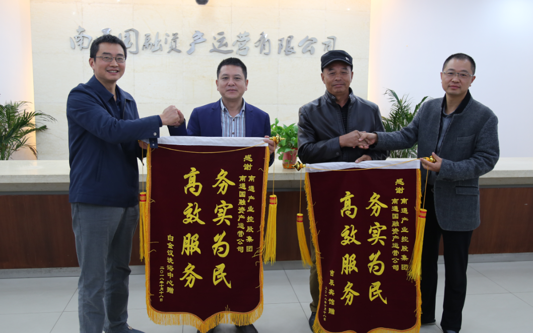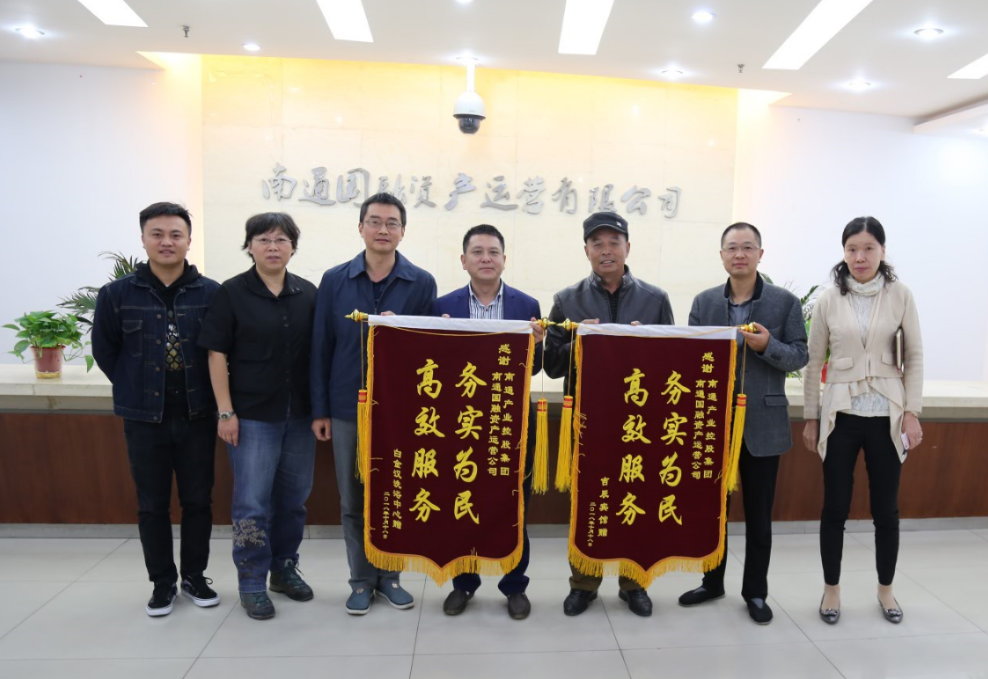 国融公司董事长姚志新、总经理刘海兵代表公司接受了锦旗。双方进行了友好的交谈。姚志新表示,获赠锦旗是对我司工作的信任与肯定。今后,我司将继续以热情周到、优质高效的服务为租赁户排忧解难,为国有资产的保值增值多做贡献。