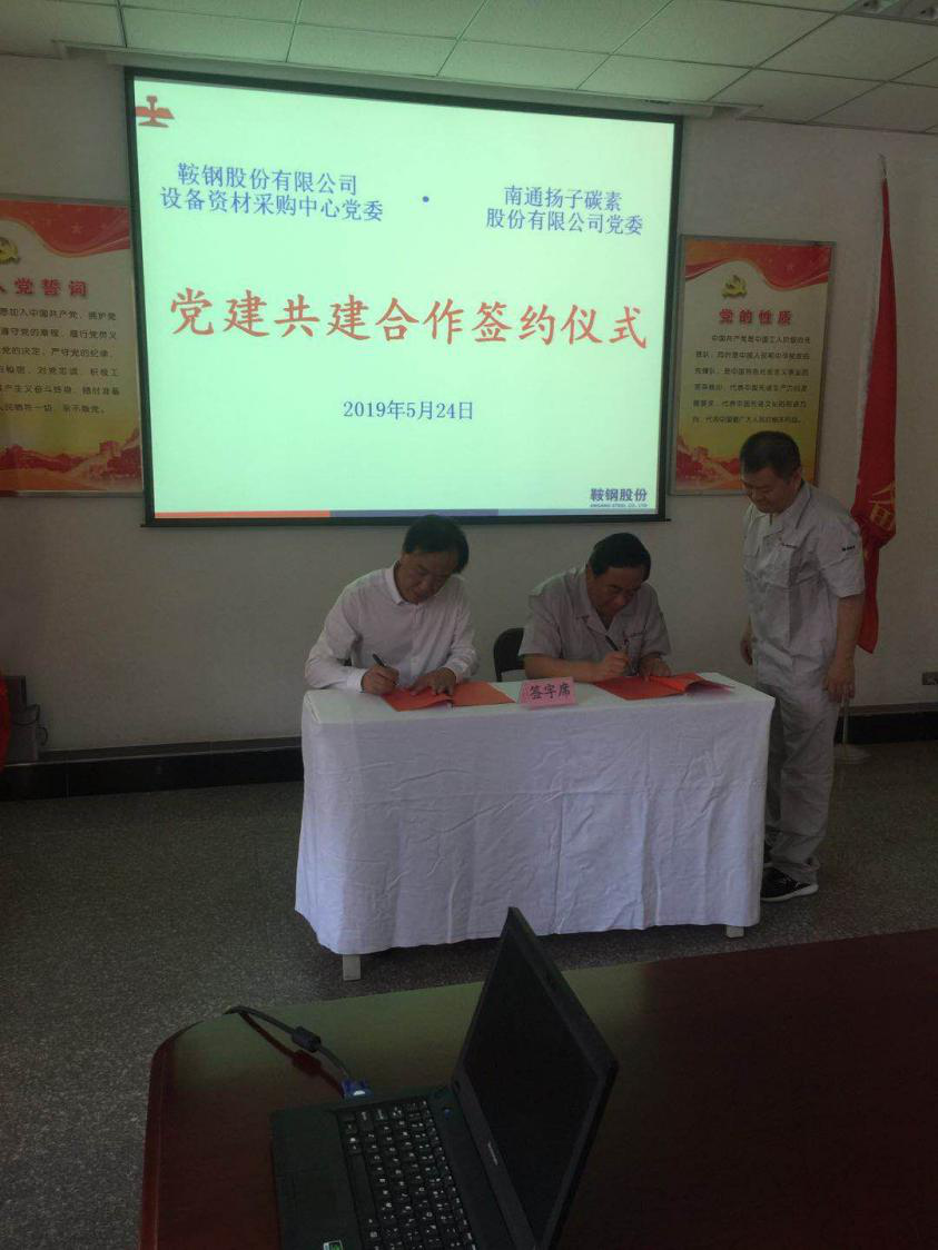 5月24日,南通扬子碳素股份有限公司与鞍钢股份设备资材采购中心党建共建合作协议签字仪式在采购中心机关党员活动室举行。采购中心党委书记于利与扬子碳素党委副书记、总经理郭承新代表各自公司在党建共建合作协议上签字。