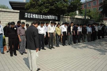 5月19日下午2:28,公司全体员工在办公楼前集中,面向国旗和四川方向,向四川汶川大地震遇难者默哀三分钟。在司办公的外单位人员同时哀悼。党委副书记、副董事长徐宪华主持哀悼仪式。