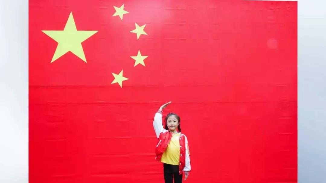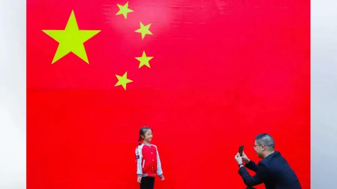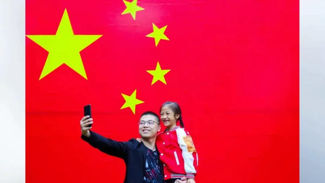 在水绘园风景区,他们看到了一幅巨大的五星红旗。周启明拿出手机,拍下自己和女儿与国旗合影的画面,让孩子接受爱国主义教育。这时,正好碰上了摄影师徐慧,拍下了这幅幸福温馨的照片。
