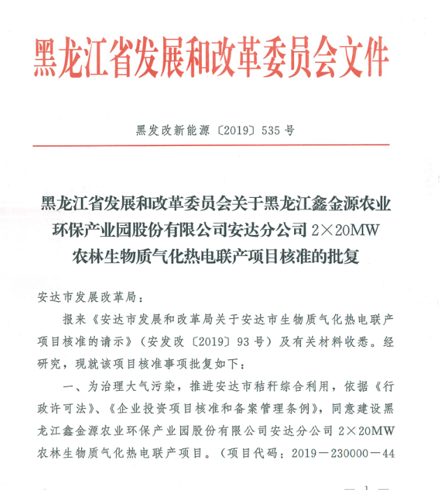 近日,黑龙江省发改委发布了《黑龙江省发展和改革委员会关于黑龙江鑫金源农业环保产业园股份有限公司安达分公司2×20MW农林生物质气化热电联产项目核准的批复》(黑发改新能源【2019】535号),安达2×20MW农林生物质气化热电联产项目通过核准。目前黑龙江鑫金源农业环保产业园股份有限公司安达分公司已与升平镇和火石山乡签约建设秸秆收储压块站,热电联产项目也落座安达市万宝山精细化学品产业园区。