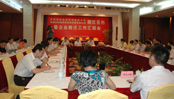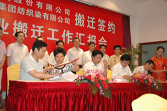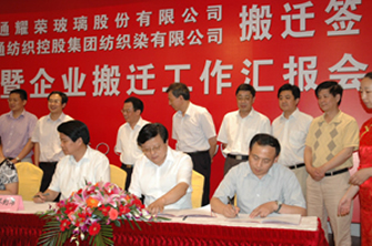 7月8日,在市经贸委主持下,我公司与耀荣玻璃、纺织染签订《企业搬迁合同》。市政府徐辉副市长、宗剑峰及崇川区、通州区、政府相关部门及我公司有关领导出席签约仪式。
