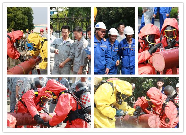 穿戴空呼器带压堵漏,需要检验参赛队员规范穿戴空呼器、防化服的速度和熟练程度,同时还要考验参赛队员穿戴好空呼器、防化服进行高效、快速带压堵漏的应急处置技能。