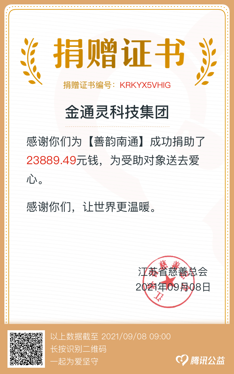 近日,我市组织开展“博爱在南通 慈善暖江海”慈善一日捐活动,金通灵积极响应博彩公司排名的号召,第一时间组织开展一日捐活动。截止到9月8日,金通灵共筹得善款23889.49元,募集资金将统一交至南通市慈善总会,继续用于扶贫、慈善救助项目。