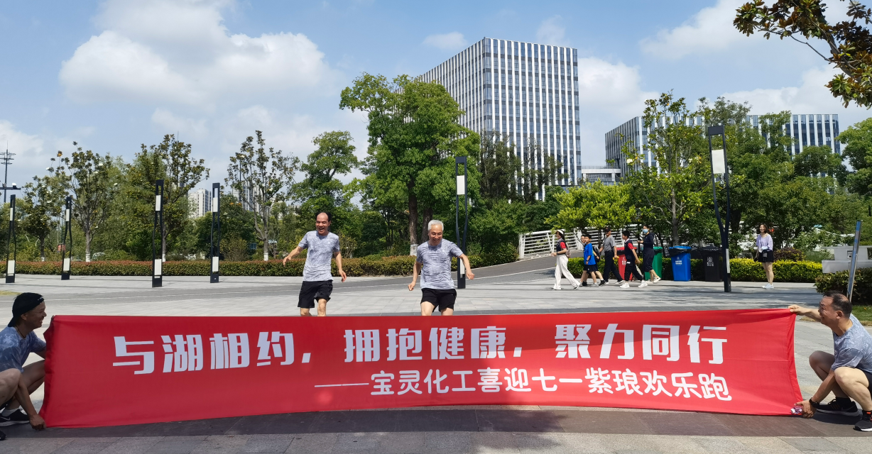 为积极贯彻国家体育总局倡导的行走运动,推广健身理念,养成积极健康、文明环保的生活方式,丰富员工的业余生活,营造企业积极向上的文化氛围,江苏宝灵化工股份有限公司于6月11日举办了“与湖相约,拥抱健康,聚力同行”喜迎七一紫琅欢乐跑活动。此次活动由公司工会主办,活动主题“低碳  绿色  健康”,活动口号“快乐运动  与你同行”,活动地点南通市中创区紫琅湖公园。